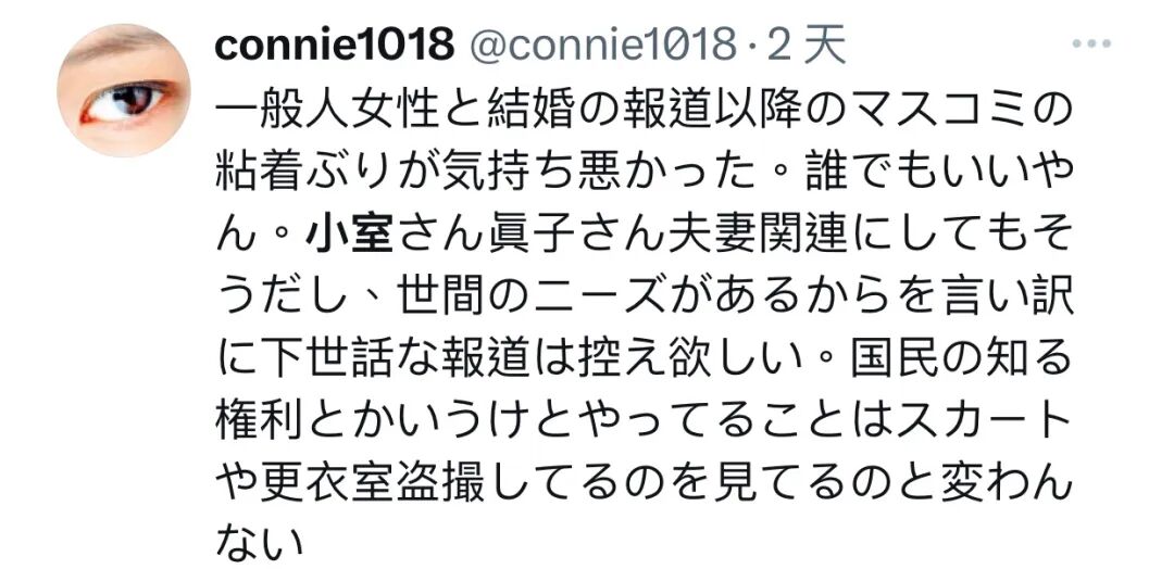 国际政治学家三浦琉丽表示,在羽生结弦离婚事件中,媒体需要承担很大的责任。因此,媒体是否可以放过小室圭和真子呢?直到如今,日本媒体总是盯着他们不放,好像也给他们在纽约工作和生活造成了麻烦。部分日本人也厌倦了媒体蹭名人流量、为了满足外界的窥探欲而对公众人物穷追不舍的做法。“自从羽生结弦宣布与素人女性的婚讯后,媒体就开始纠缠他们,真的让人作呕。他们对小室圭真子夫妻也是这样。希望媒体们不要再以‘满足大众需求’为借口进行各类不实不雅的报道,媒体这种为满足公众知情权而做的事情,不亚于那些偷窥别人穿短裙和在更衣室偷窥的变态。”