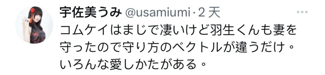 “小室圭的确挺厉害的。不过羽生君也是为了保护自己的妻子。保护的具体方式不同而已,而爱的方式也有很多种。”