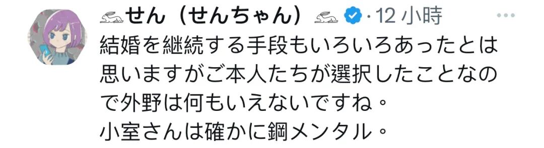 “我认为让婚姻延续下去的方式有很多种,但既然是他们夫妻的选择,那外人也不方便说什么。不过,小室圭确实有钢铁般的心态。”