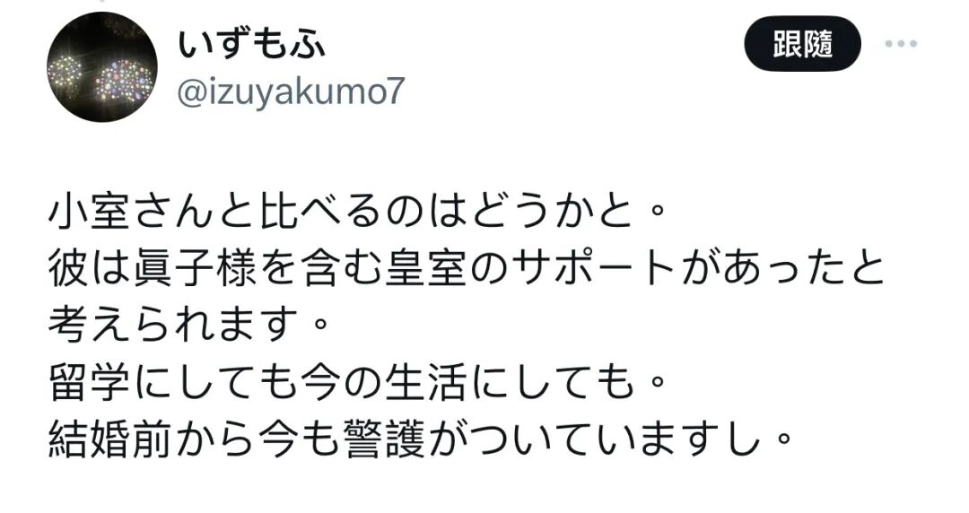 有人表示,小室圭是“皇室驸马”,再不济也会有安保人员贴身保护。“我不知道小室圭是否可以拿来做比较。无论是出国留学还是现在美国生活,据闻他一直都得到皇室的支持,其中就包括了真子公主的支持。在他们结婚之前,身边一直都有安保人员。”