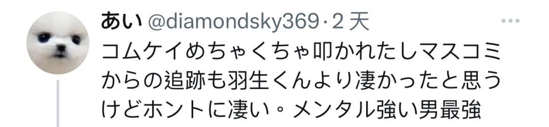 “小室圭受到了很多抨击和恶评,我认为他受到来自媒体的猛烈抨击比羽生君更甚。但他真的很了不起,不愧是最强精神强者。”