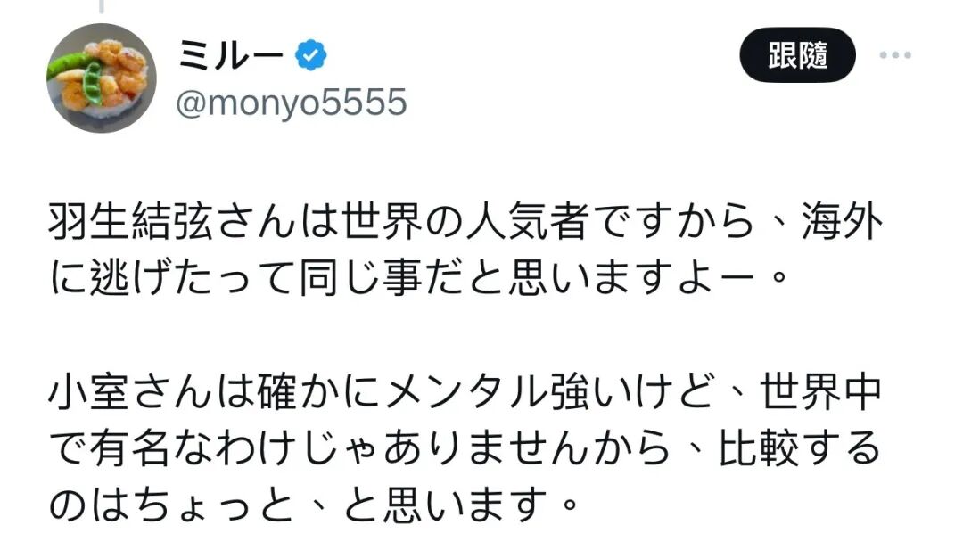 有人指出,小室圭出了日本就没人认识他,因此可以轻松过活。但羽生结弦不同,即便移居海外,麻烦事情也不会就此终止。“羽生结弦在全世界都很受欢迎,因此我想他就算跑到海外结果也是一样的。小室圭的精神固然很坚强,不过他并没有在全世界闯出名堂。因此我认为这样比较不太适合。”