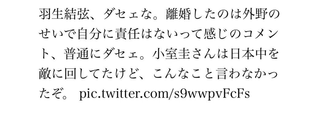 “羽生结弦啊你真不行。居然将离婚的责任抛给外界,自己似乎撇得一干二净。小室圭虽然一直都与日本全体国民为敌,但是他从来都没有说过类似的话、甩锅给外界。”