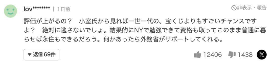 有人直言,小室圭心态强,主要原因在于他要死守“皇室驸马”这个身份。毕竟做了驸马,就等于第二次投胎。“小室圭的风评真的会因此变好吗?在他看来,做驸马这可是比中彩票还厉害的机会吧。他肯定不会错过的。如果能在纽约学习、工作,拿到资格证、继续这样正常生活下去的话,应该是可以拿到永住资格吧。就算他们有什么事,日本外务省都会帮助他们的。”