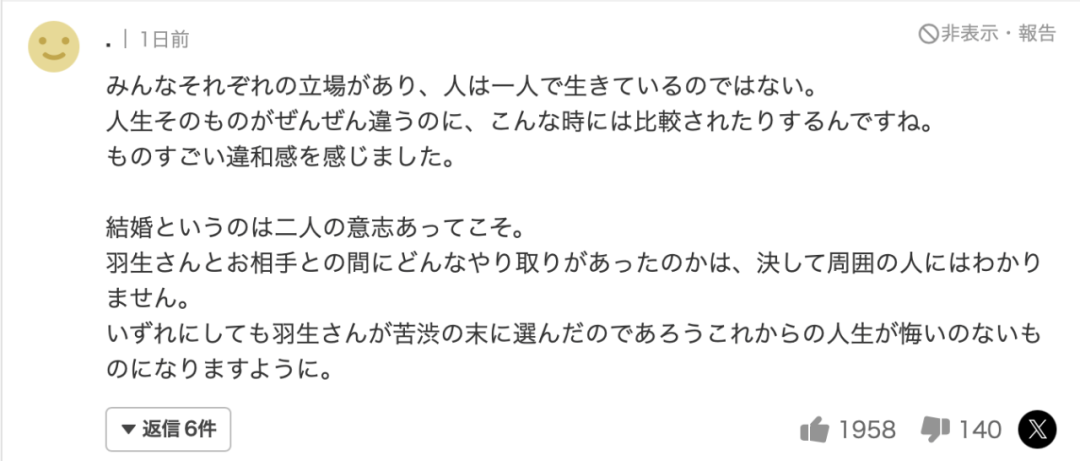 “每个人都有自己的立场,人们并非独自为自己而生活的。每个人的人生本来就完全不同,在这种时候却拿来比较,我感到很违和。何况结婚只是两个人之间的事情,旁人都绝对不会知道羽生结弦和妻子之间究竟发生了什么事情。不管怎么说,希望羽生结弦在经历此苦后,今后的人生不再后悔吧。”