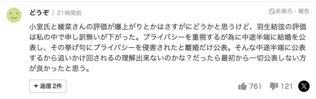 “先不说小室圭或者加藤绫菜的风评因为此事有什么变化,但是很抱歉,羽生结弦在我心中印象的确是下滑了。说是重视隐私,突然就公布婚讯,后来又因为隐私被侵犯而选择离婚。那最好从一开始就不要公布啊。”