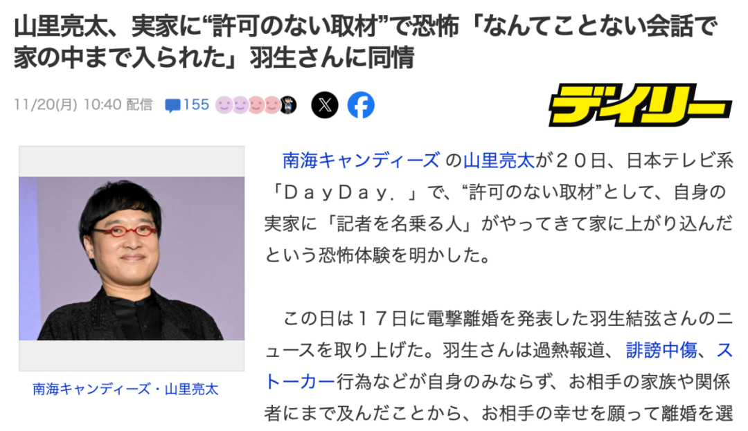 著名演员苍井优的丈夫山里亮太表示,对于羽生结弦的遭遇表示身同感受。因为自己也曾遭遇过自称是记者的人去到他的老家,通过一些无关紧要的问题,甚至被家人信以为真、直接带入了家里。