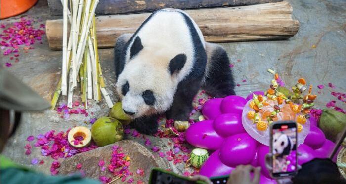 11月25日,海南热带野生动植物园为熊猫兄弟贡贡、舜舜举行登岛5周年系列庆祝活动。图为熊猫享用具有海南特色的主题大餐。(图/中新网)