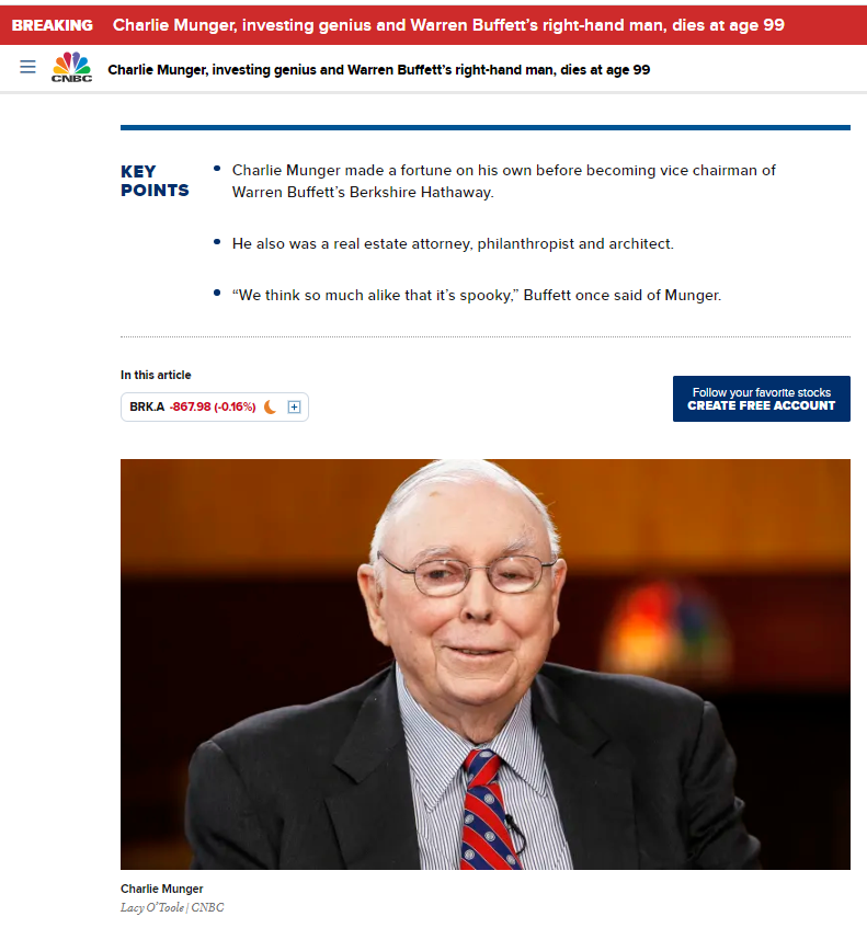 美国投资大师、沃伦•巴菲特的得力助手查理•芒格去世,终年99岁。(图/美国消费者新闻与商业频道报道截图)