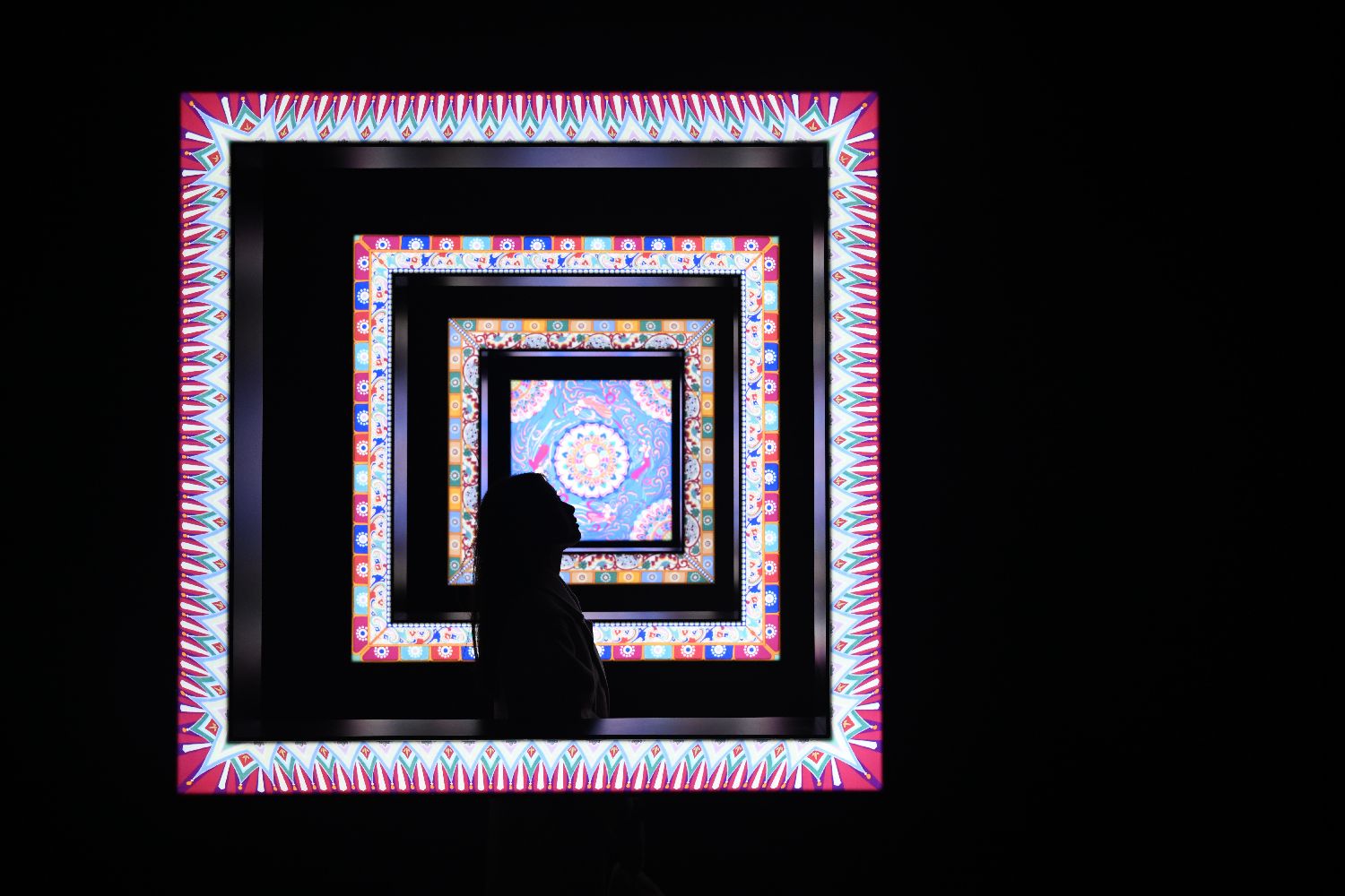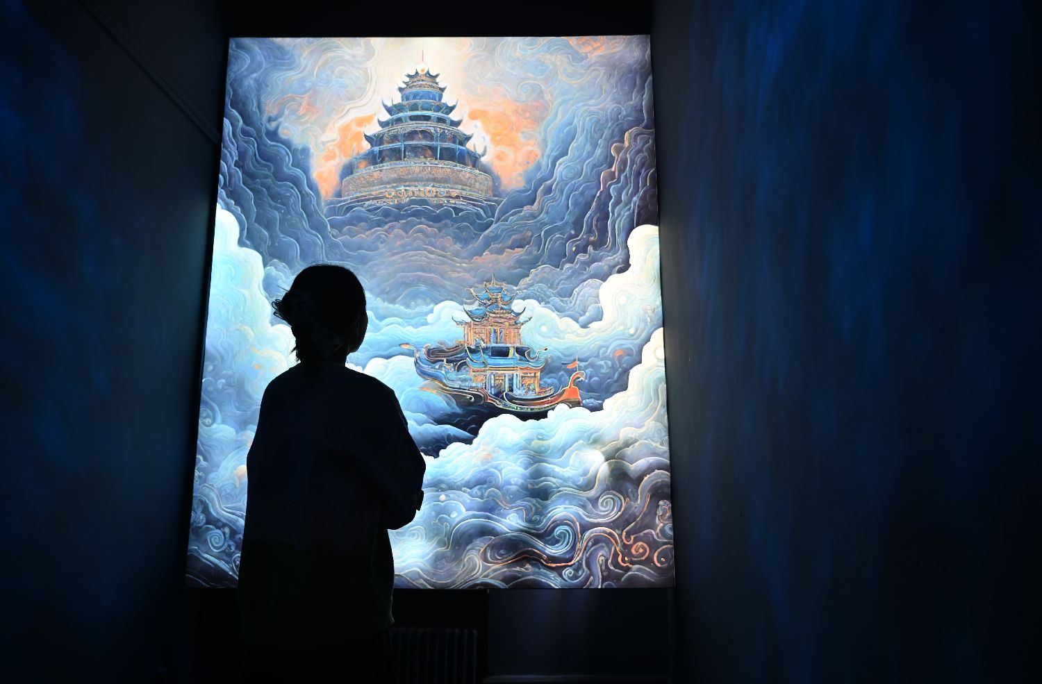 11月28日,在天津数字艺术博物馆,观众在一幅艺术家重绘的敦煌壁画作品前驻足欣赏。当日,“发现敦煌——敦煌艺术情景式特展”在天津数字艺术博物馆举行媒体开放日活动。特展按时间顺序分为“发现敦煌”“守护敦煌”“传承敦煌”三个部分,以数字艺术再现千年敦煌之美。展览将持续至2024年3月。(新华社)