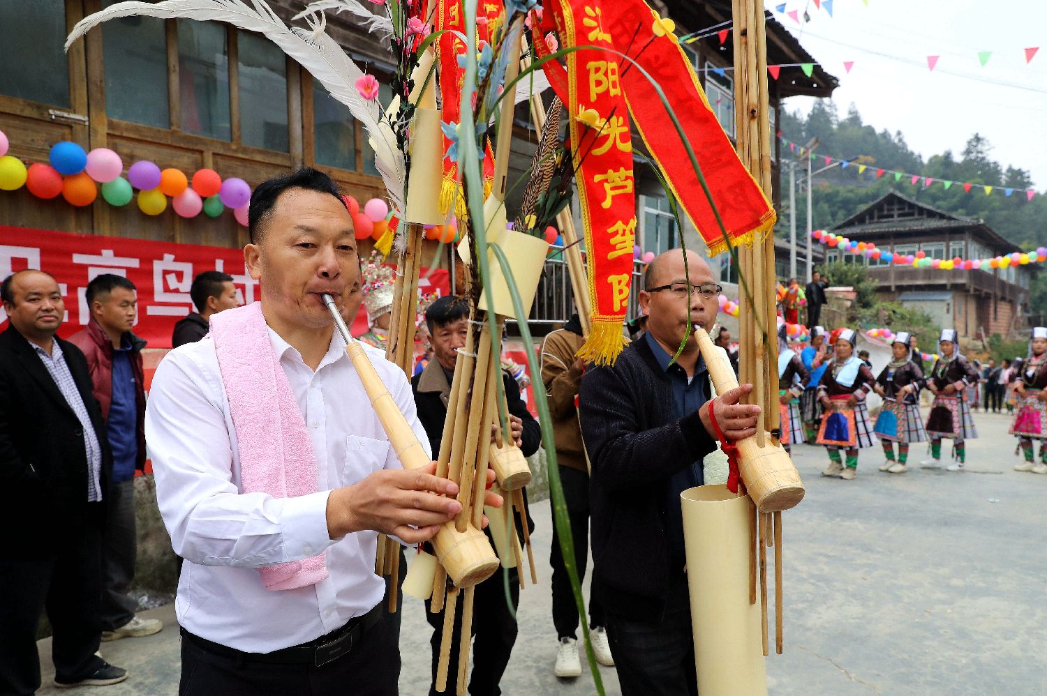 11月30日,苗族同胞盛装在苗年活动中吹芦笙。(中新社)