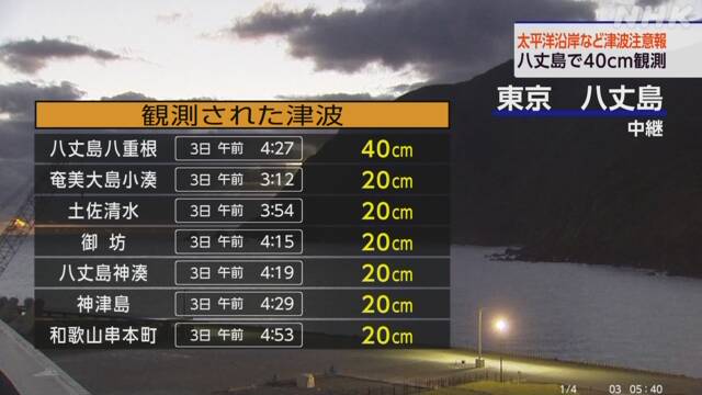 各地在黎明时都观测到了海啸波,奄美大岛小凑凌晨3时12分观测到了20厘米的海啸,随后在伊豆群岛八丈岛八重江凌晨4时27分观测到了40厘米的海啸。