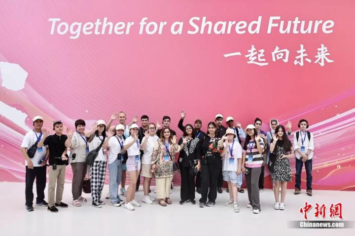 2023年7月,上海合作组织成员国青少年夏令营暨“上合小记者”系列活动举行,小记者在国家游泳中心“水立方”内合影留念。(图/中新网)