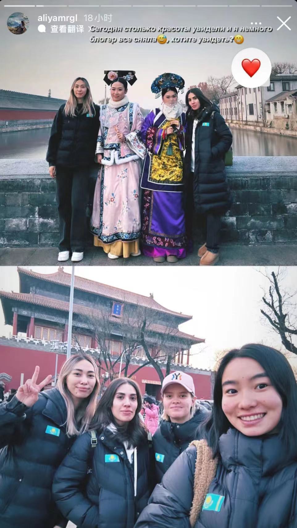 哈萨克斯坦队运动员们则先后参观了天安门、王府井、故宫等北京的旅游胜地,还与身穿传统服饰的中国游客合了影。
