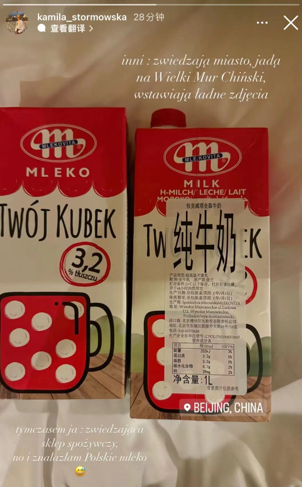 芬兰队运动员则是晒出了自己去中国超市买的牛奶。仔细一看,这瓶牛奶的原产国是波兰。