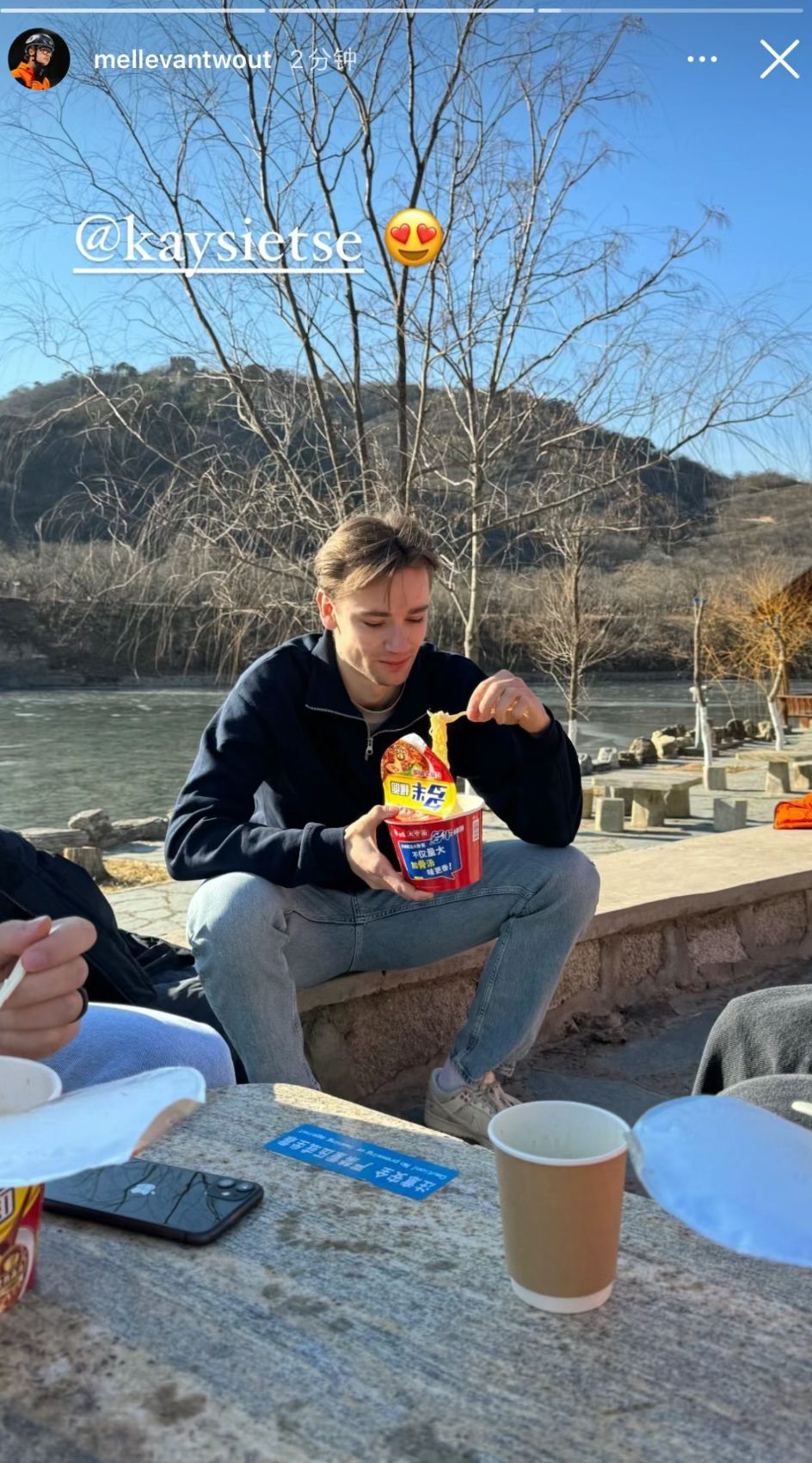 爬过了长城之后的午饭时间,荷兰男队选择了品尝中国的方便面。有中国网民留言说,“没人给他们来点自热锅吗”“告诉他们要加火腿和榨菜”“火车上吃泡面其实更香哦”。