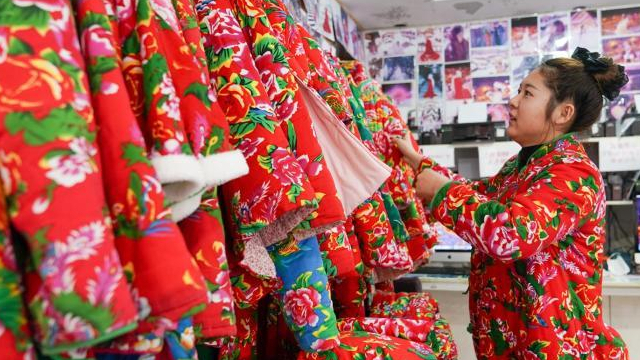 雪乡为游客拍照提供的东北大花棉袄。(图/中新网)