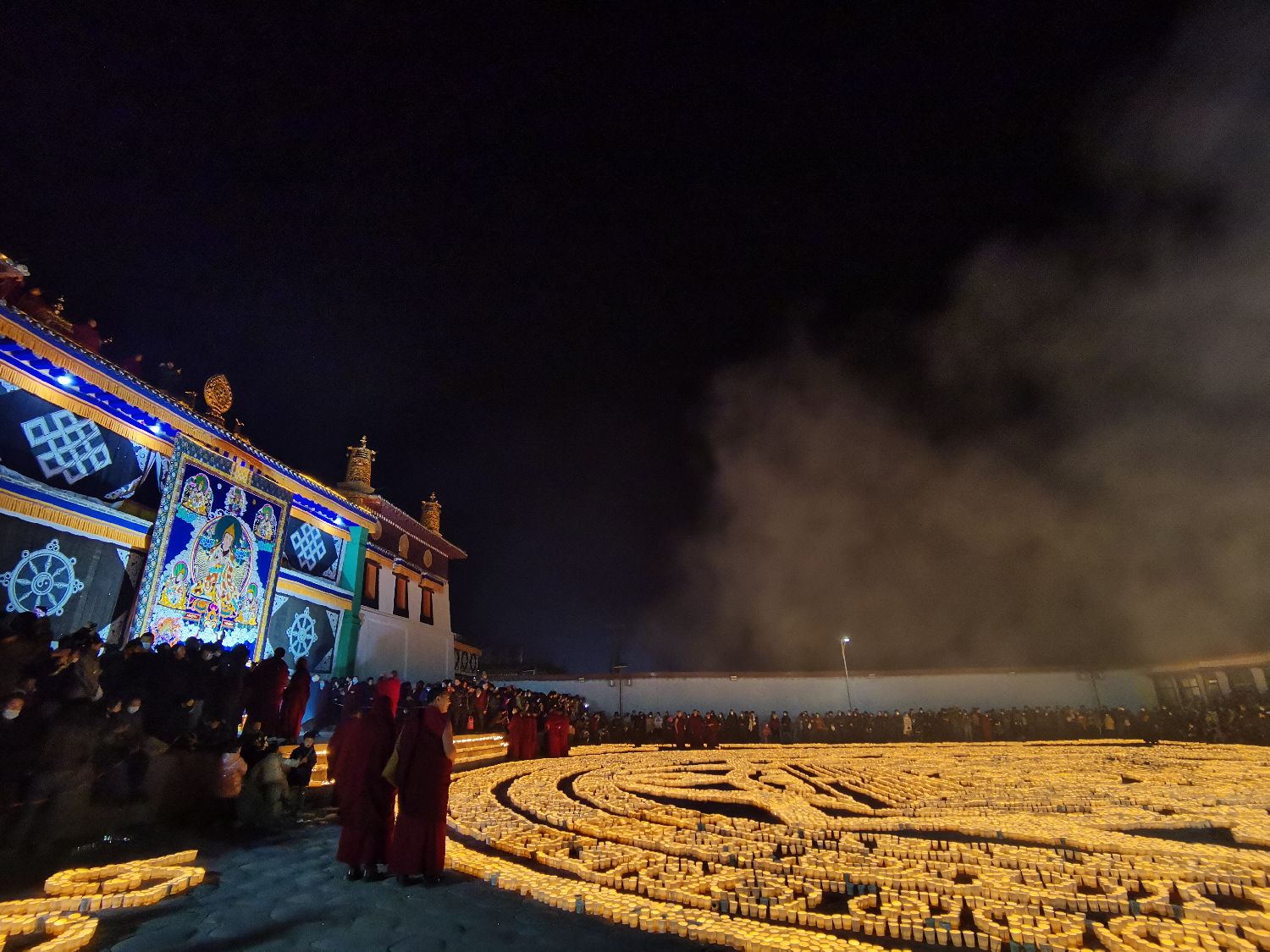 香则·久麦成列尖措说,过去,僧众会在大经堂的房顶上燃灯、诵经、吹法号,而如今,很多僧俗信众选择在大经堂前的广场上燃灯。
