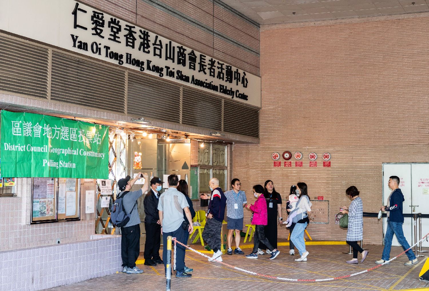 图为市民前往新界火炭的仁爱堂香港台山商会长者活动中心的投票站投票。(图/中新社)