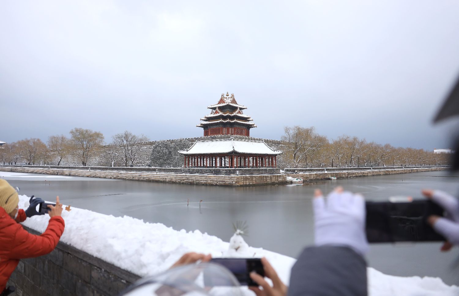 12月11日,游客在北京故宫角楼外拍摄雪景。当日,北京迎来2023年入冬后首场降雪,雪落北京城尽显古都风韵,银装素裹。(郑闻 摄)