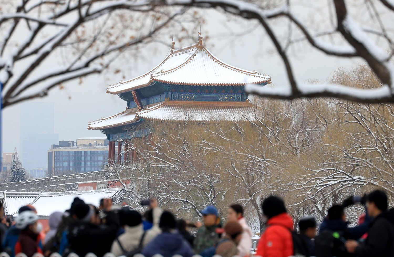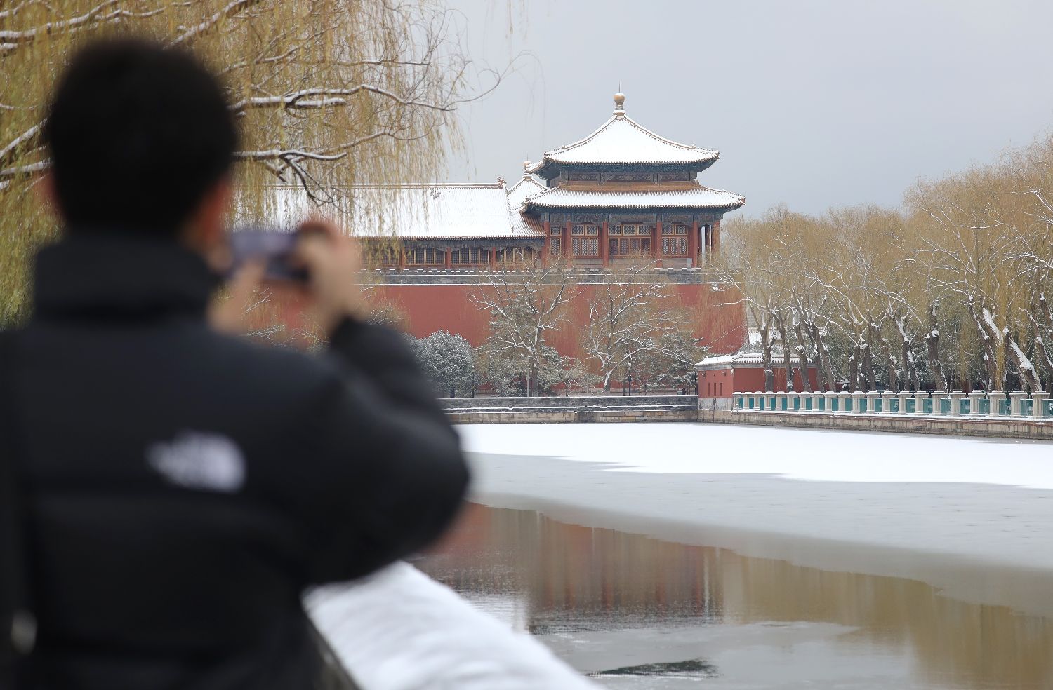 12月11日,北京故宫左燕翅楼换“银装”,吸引游客拍摄。(郑闻 摄)