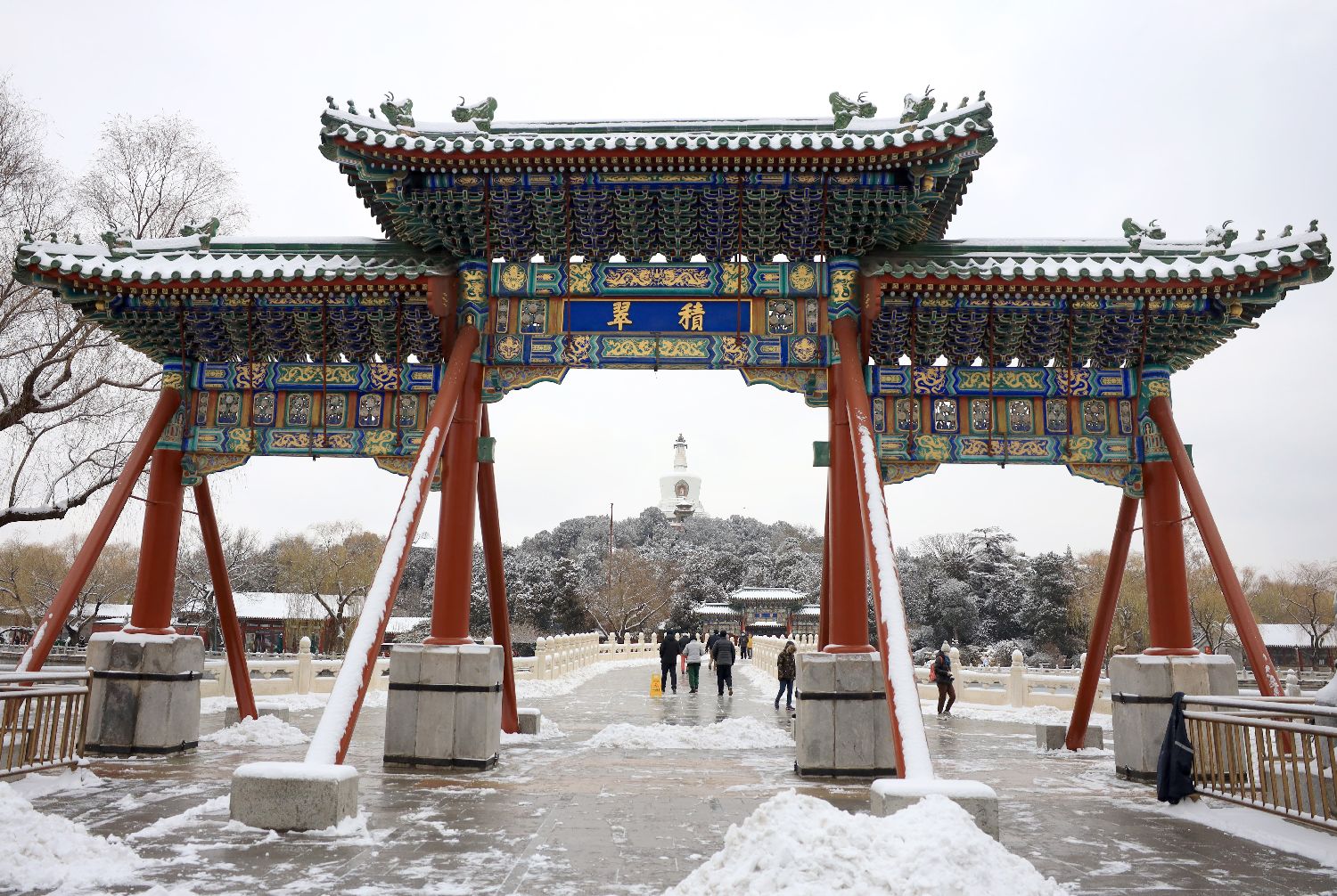 12月11日,雪后的北海公园吸引游人参观。(郑闻 摄)