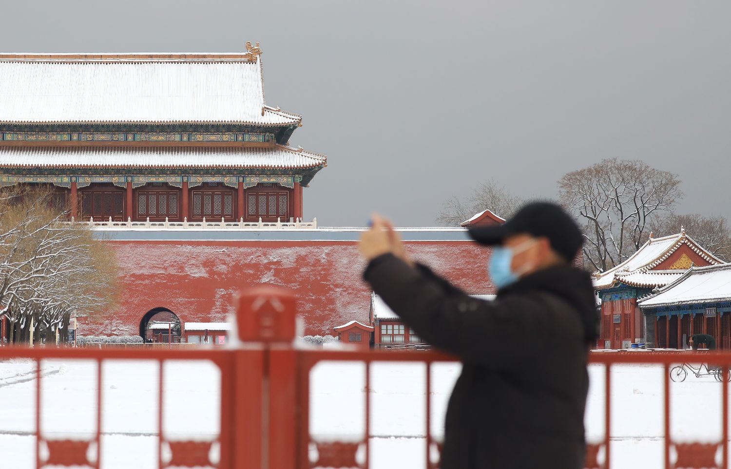 12月11日,游客在北京故宫午门外参观雪后美景。(郑闻 摄)
