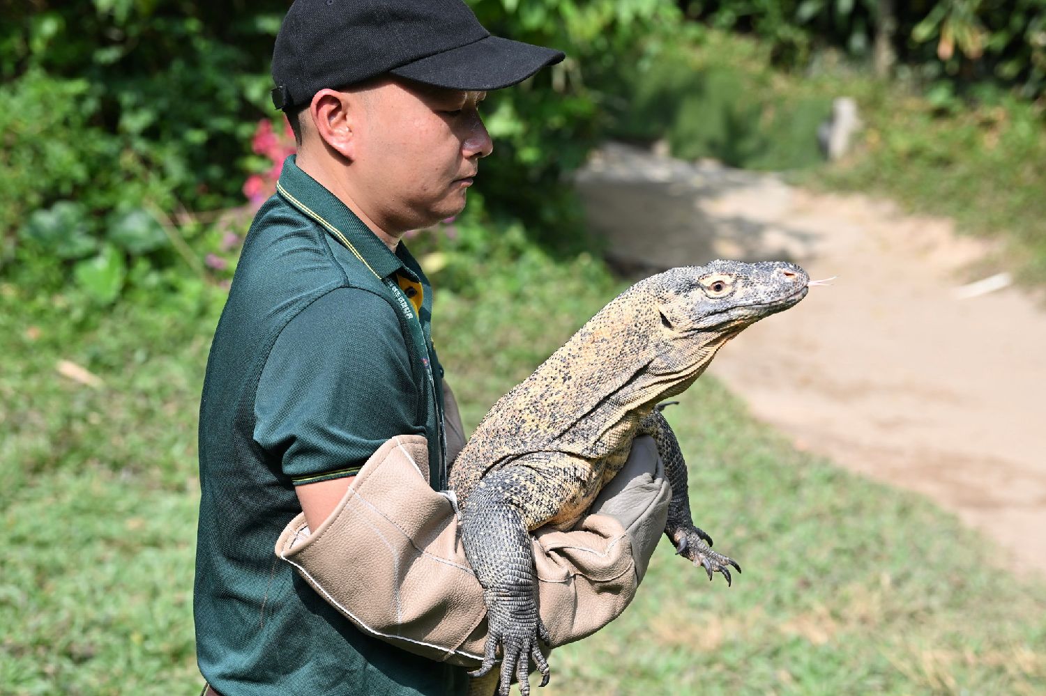 园区保育团队的工作人员表示,由于科莫多龙自带毒液腺体,保育员们喂食时都需要佩戴防护手套,被幼崽莽撞扑食误咬手的情况偶有发生,每次喂食过程充满挑战。