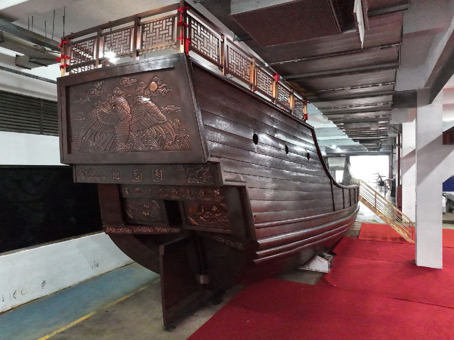 船头上翘,巨帆高扬,三艘铜船如真船般大小。其中,最长的是能航行于深海尖底的遮洋船,长达19米。其次为漕舫船,船长15米,漕舫船大可载千石粮食,也搭乘客,较为华丽。最短的为漕运驳船,也有12米之长。