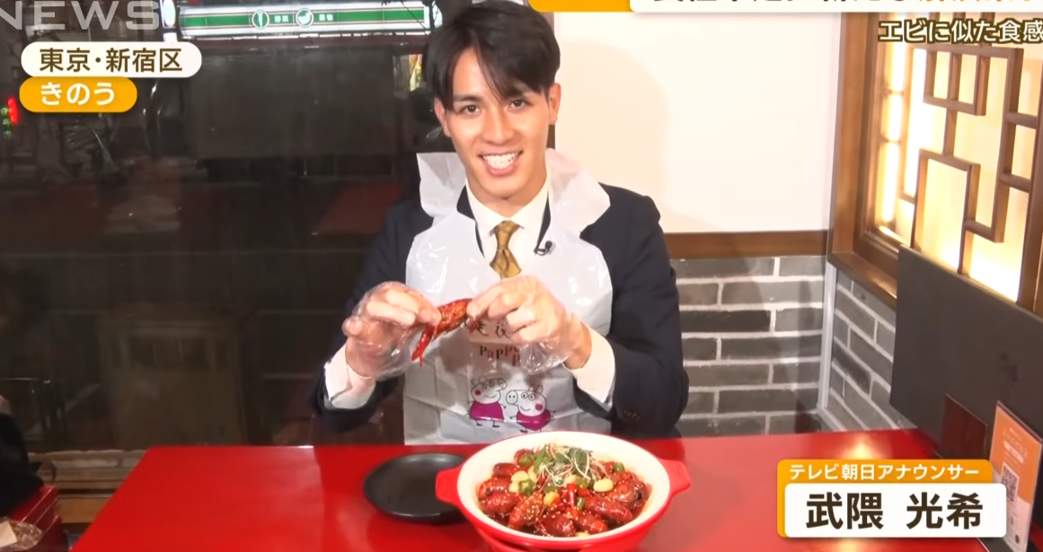 朝日电视台播音员试吃炒麻辣小龙虾。(图/YouTube截图)
