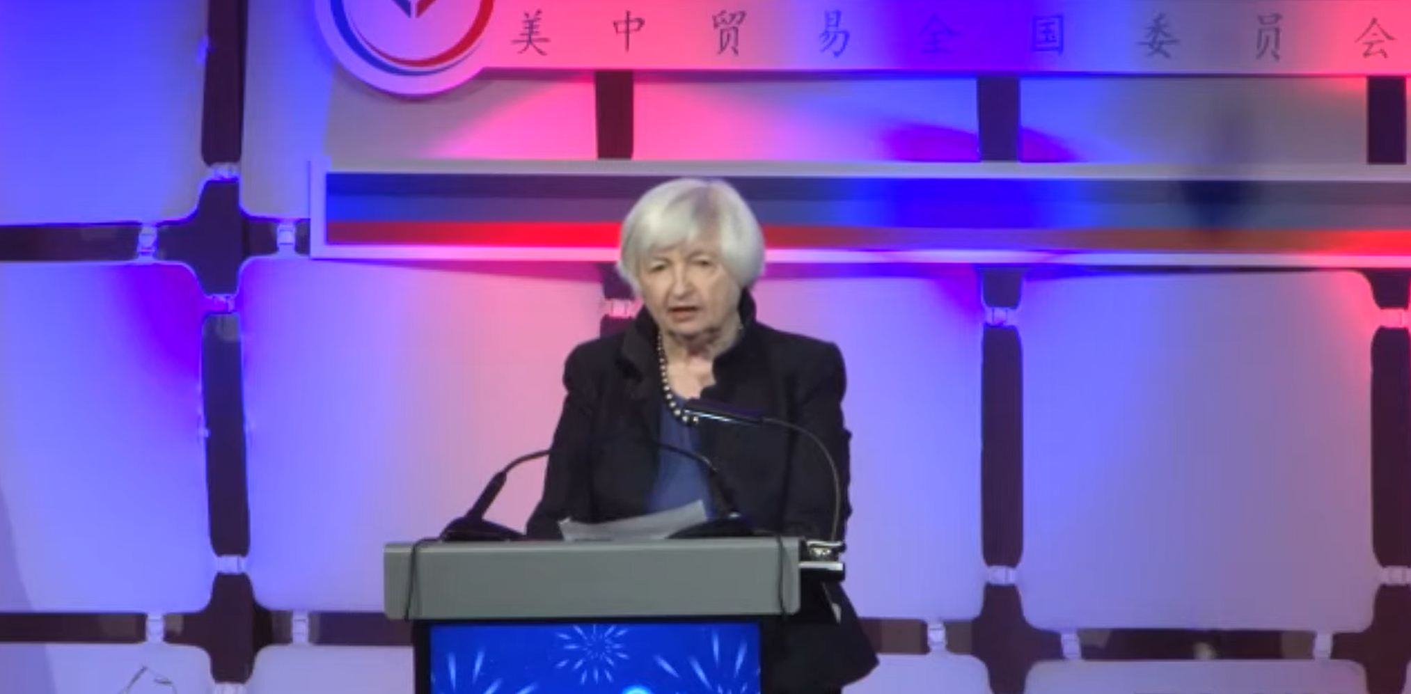 当地时间14日,美国财长耶伦在华盛顿举行的美中贸易全国委员会成立50周年庆典上发表讲话视频截图图源:美中贸易全国委员会
