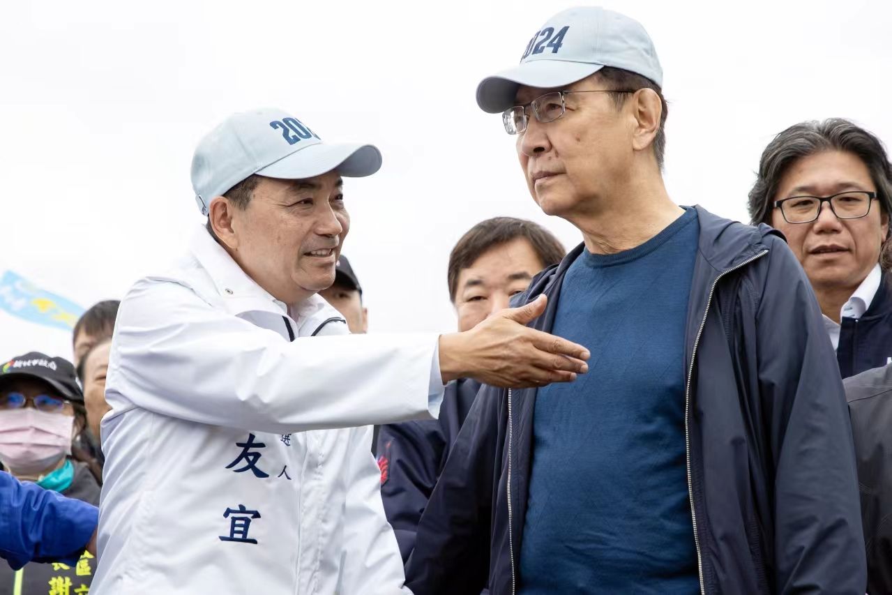 图为2024年台湾地区领导人选举中国国民党候选人侯友宜(左前)与其搭档副手候选人赵少康(右前)。(图/香港中通社)