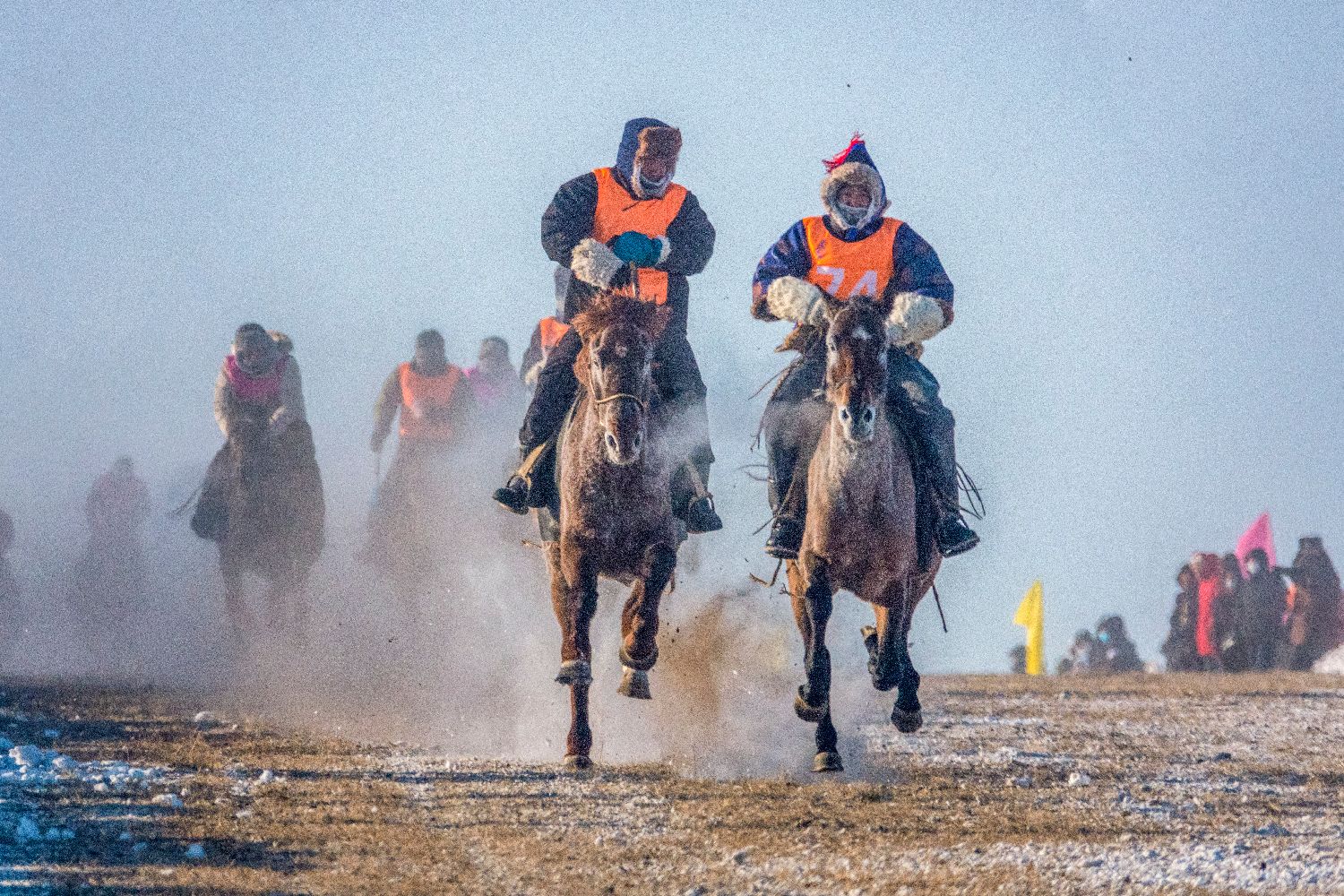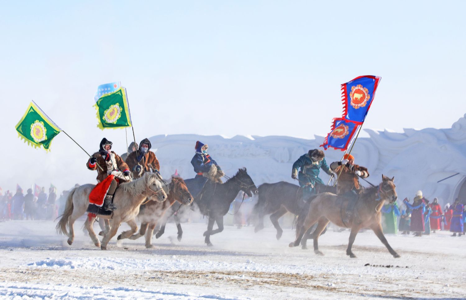 内蒙古自治区第二十届冰雪那达慕17日在呼伦贝尔市陈巴尔虎旗开幕。冷冷冰雪没有浇灭热情,游客与当地牧民共襄盛举,沉浸式感受草原野性之美。图为蒙古马1000米速度赛现场。(中新社)