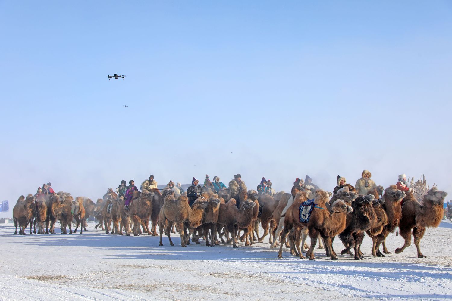 牧民在内蒙古自治区第二十届冰雪那达慕开幕式上表演赛骆驼,无人机全程跟拍。(中新社)