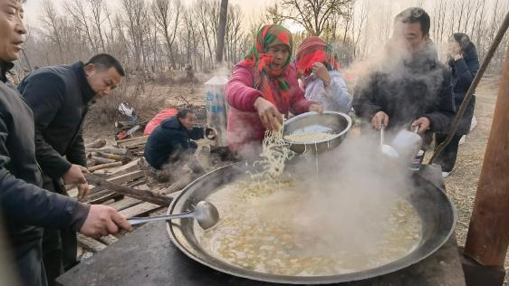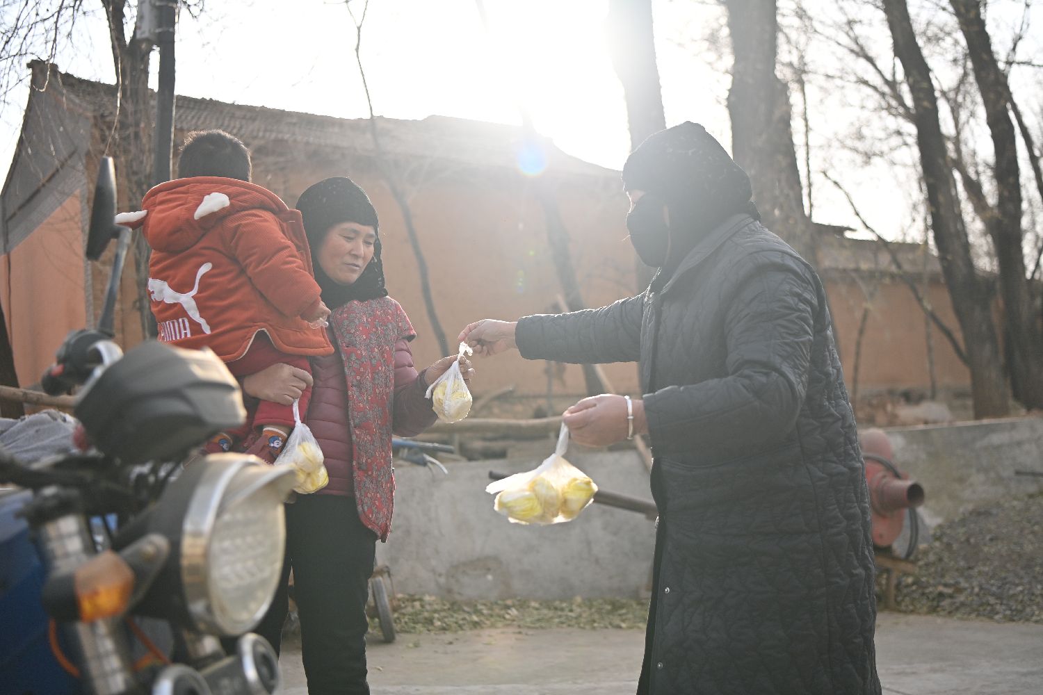 19日,甘肃省临夏州积石山县大河家镇韩陕家村十一社社长叶发土麦(右)给村民发花卷。(图/中新社)