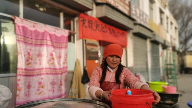 19日,在青海省震区中川乡爱心餐摊位前,面条铺老板收拾锅具。(图/中新网)