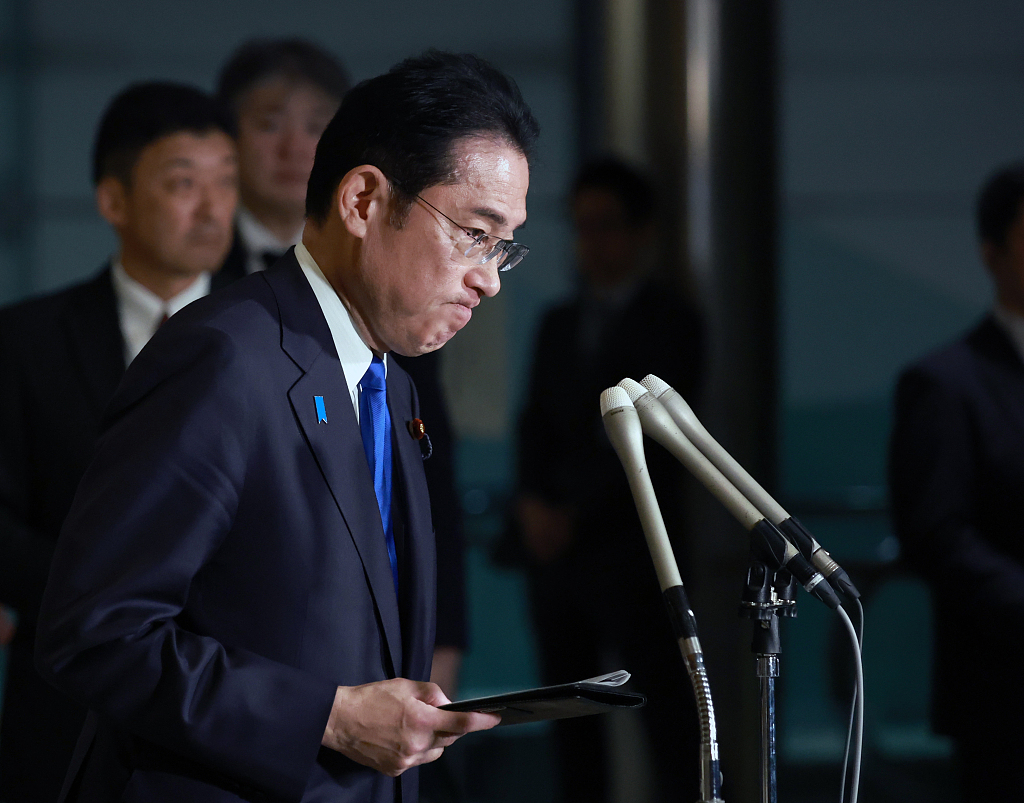 “黑金”丑闻重创自民党,岸田政府4名阁僚被撤换。图片为日本首相岸田文雄在首相办公室向记者发表讲话后鞠躬。(视觉中国)