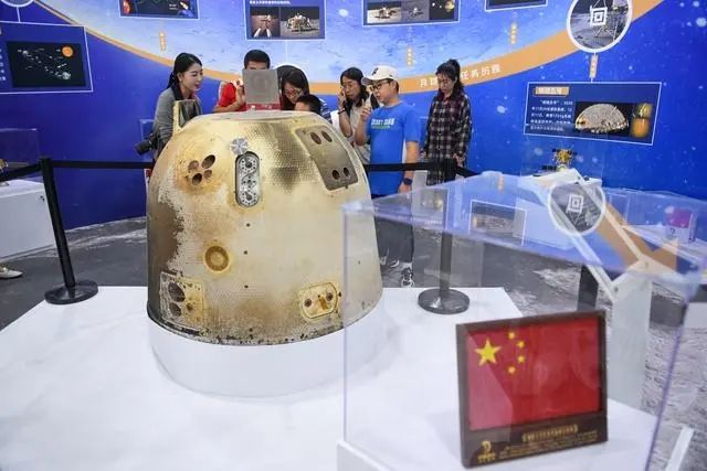9月17日,在中国科普日北京主场活动展区,参观者参观展出的嫦娥五号再入返回飞行试验任务返回器。(图/新华社)