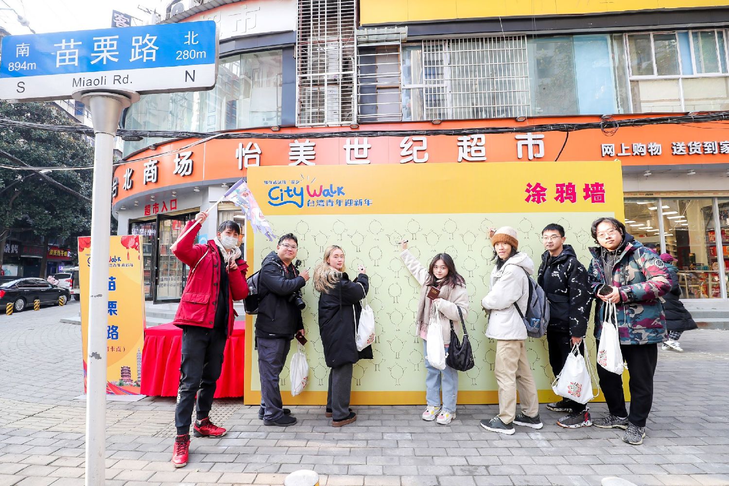 “学业事业顺顺利利”“考研上岸”“天天开心”“身体健康,心想事成”……在云林街打卡点,台青纷纷在心愿墙上写下新年愿望。在苗栗路打卡点涂鸦墙,台青画下一张张笑脸,并合影留念。