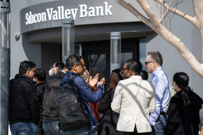 2023年3月13日,加州圣克拉拉市,硅谷银行总部门前排队等待办理业务民众的背影。(图/中新社)