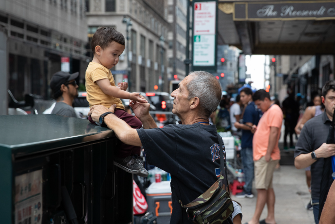 2023年8月15日,纽约曼哈顿,一家收容庇护移民酒店门前的背影。(图/中新社)