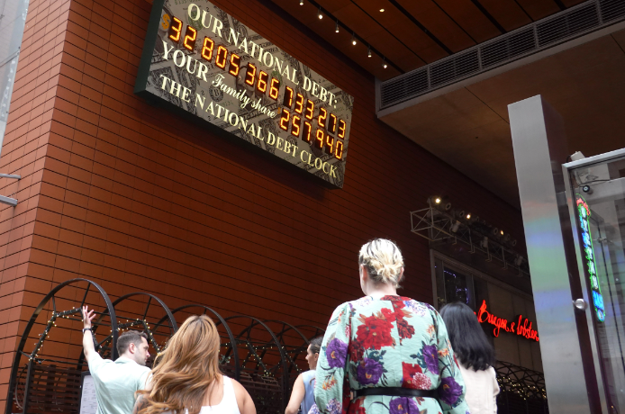 2023年8月15日,纽约曼哈顿,美国“国债钟”显示屏前的背影。(图/中新社)