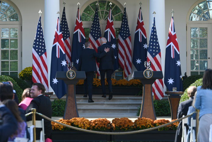2023年10月25日,华盛顿白宫,美国总统拜登与澳大利亚总理阿尔巴尼斯的背影。(图/中新社)