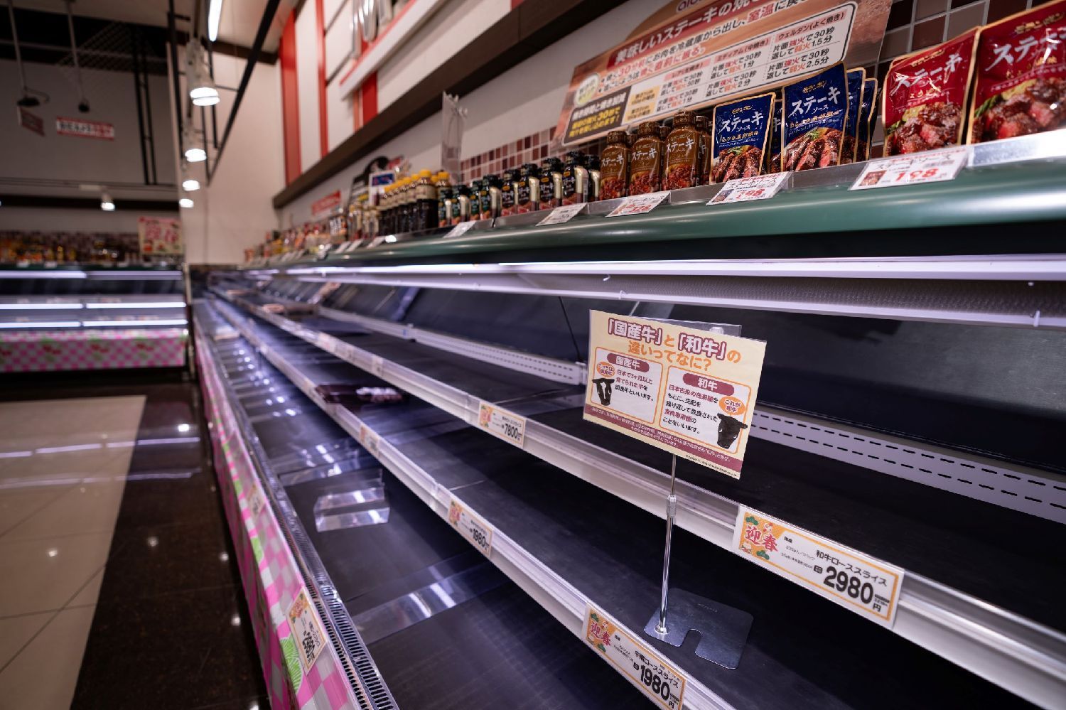 图为1月2日在石川县羽咋郡一家大型超市拍摄的食品货架。超市部分物资短缺。(图/新华社)