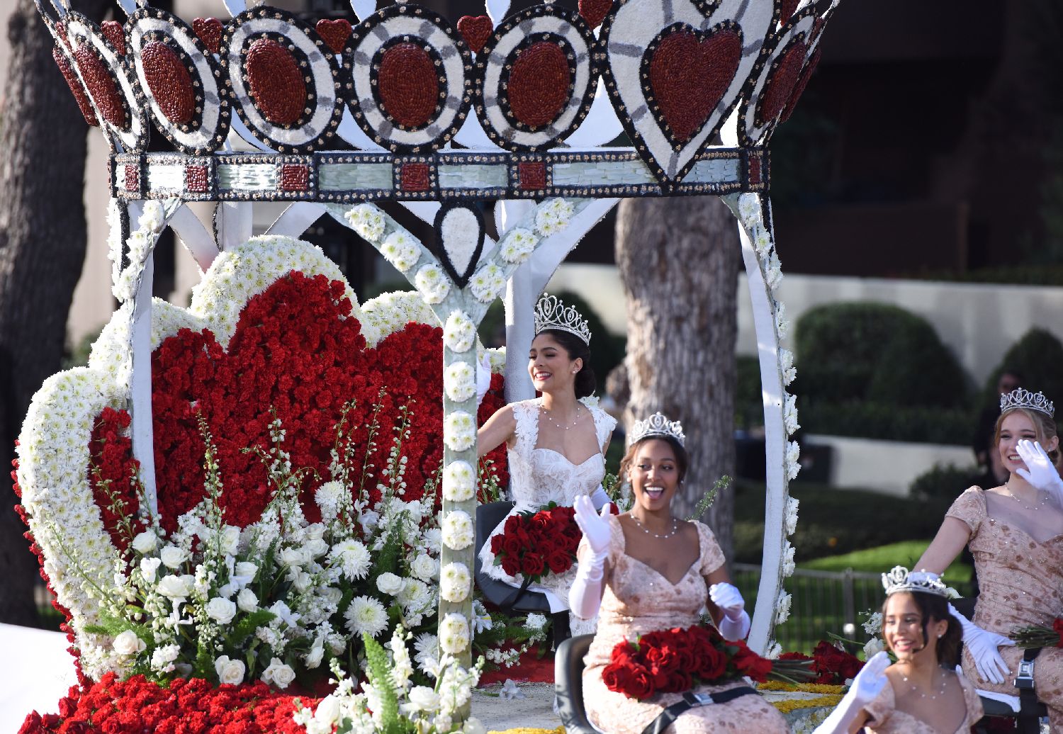 率先登场为花车开道的是帕萨迪纳市警察摩托车队,平日威武的警车此刻亦用鲜艳的红玫瑰点缀。随后,在全程5.5英里(约8.85公里)的游行道路上,由39辆花团锦簇、造型各异的花车和19个载歌载舞的行进乐队以及18个马术方队等组成的逾80个游行队伍陆续亮相。