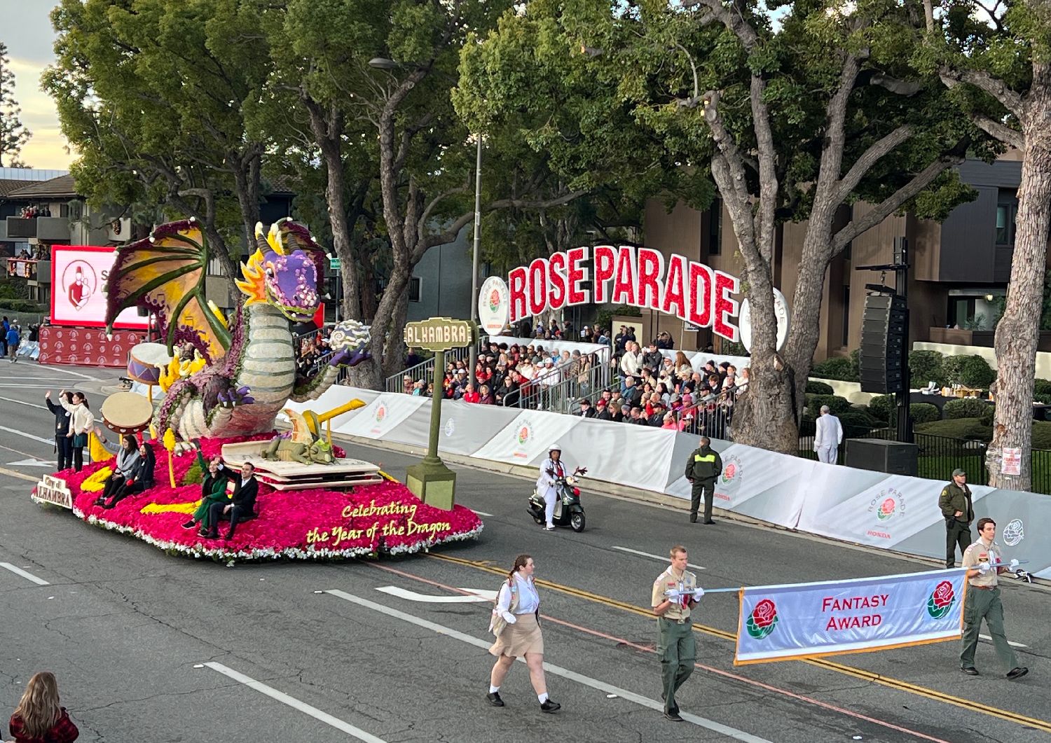 按照玫瑰花车游行的传统,花车由鲜花与枝叶等天然材料装饰而成。2024年度“玫瑰皇后和玫瑰公主”花车、第110届“玫瑰碗”橄榄球赛花车、关爱儿童和重视环保等主题花车各具匠心。值得一提的是,在中国传统节日龙年春节即将到来之际,南加州华人聚居地阿罕布拉市带来以“庆祝龙年”为主题的花车,用花朵融汇龙、音乐与爱等元素,凭借“奇幻与想象力方面的出色展现”荣获花车设计“想象力奖”。