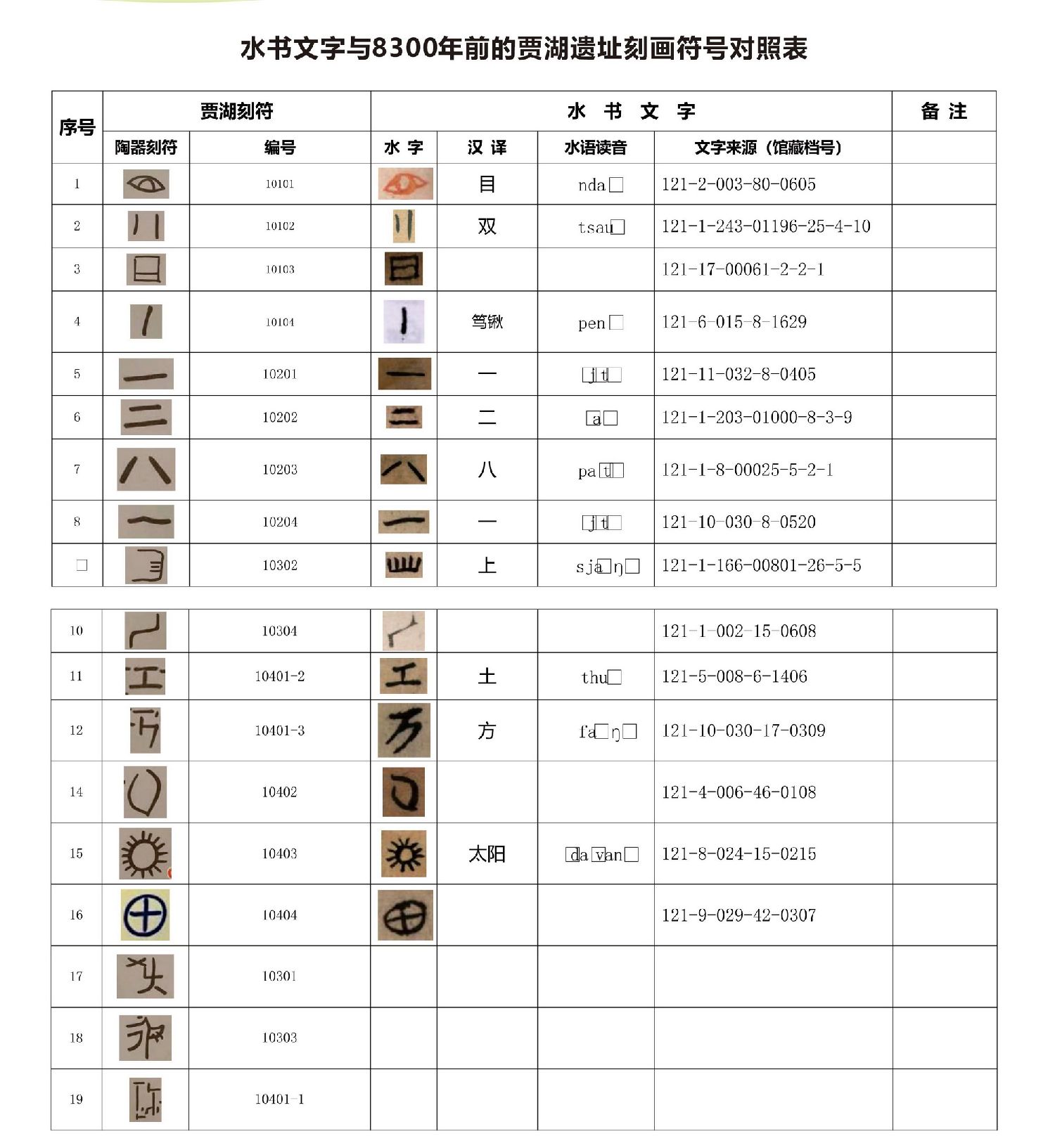 中国贵州省黔南布依族苗族自治州水书申报《世界记忆遗产名录》领导小组办公室、黔南州档案馆最新研究发现,中国水书文字与中国河南省偃师市二里头夏都遗址出土的24个刻画符号相同,与中国浙江省良渚文化遗址出土的700多个刻画符号中的104个符号相同,与中国安徽省蚌埠市双墩遗址出土的600多个刻画符号中的73个符号相同,与中国河南省贾湖遗址出土的19个刻画符号中的16个符号相同。