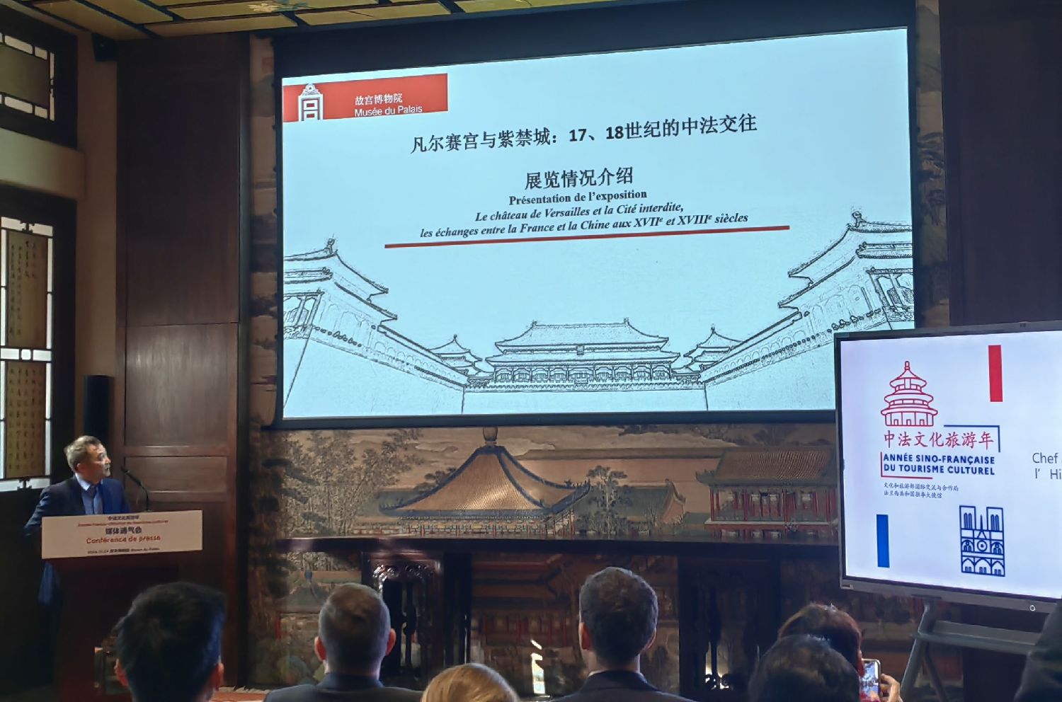 故宫博物院院长王旭东和法国驻华大使白玉堂出席媒体通气会并致辞。