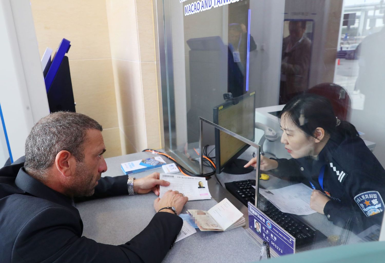 2023年11月9日,工作人员向意大利参展商马可(左)介绍签证回执上需要注意的信息。(图/新华社)