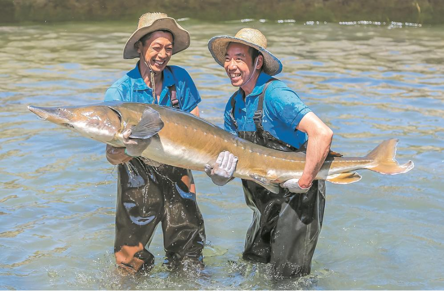 四川润兆渔业公司天全基地工作人员抱起硕大的鲟鱼。(图/《成都日报》)